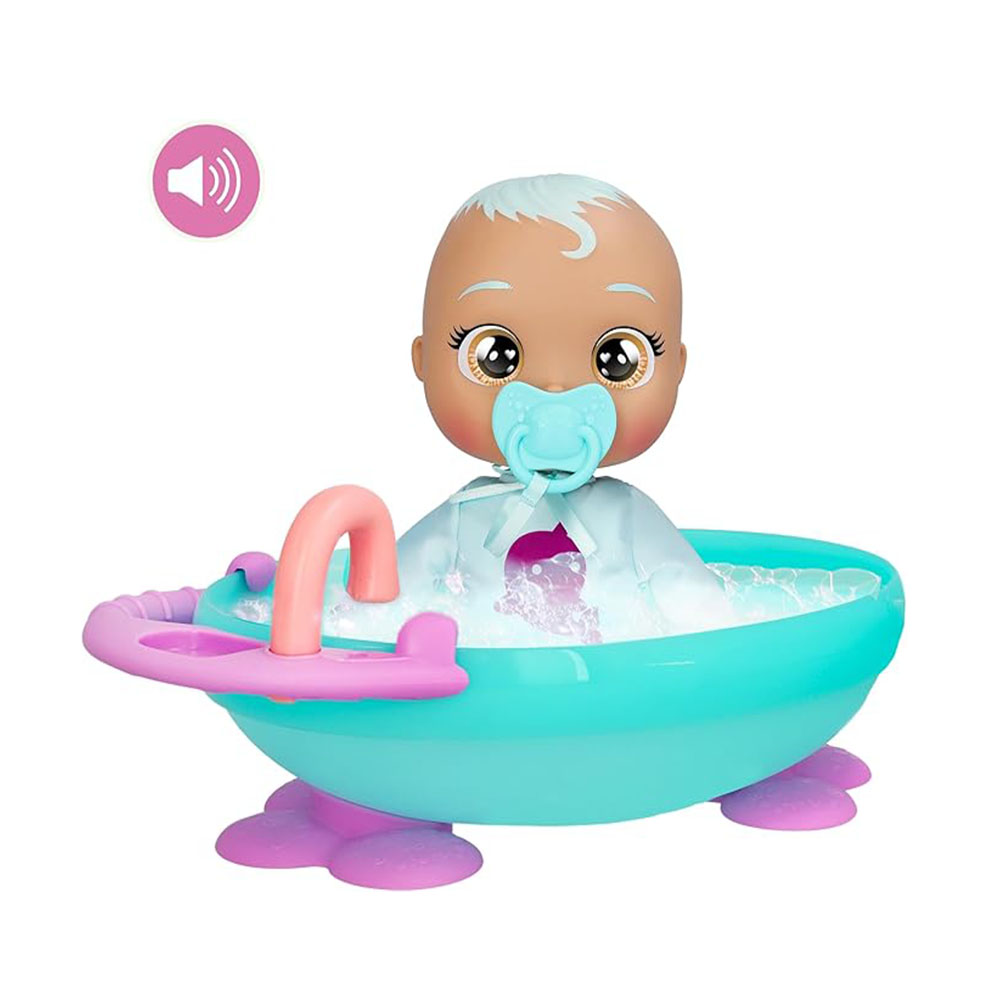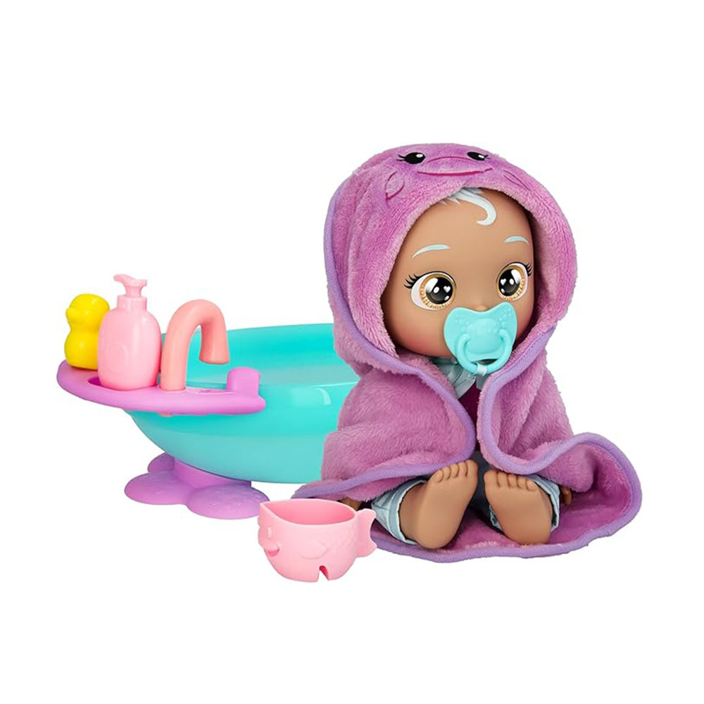 - ¡Cry Babies Newborn Dana está lista para bañarse con su bañera a juego! ¡Ella reacciona al agua con sonidos de bebé! Envuélvela con su toalla de narval rosa personalizada para secarla. Incluye 6 accesorios. Ella llora lágrimas reales cuando presionas su cabeza.