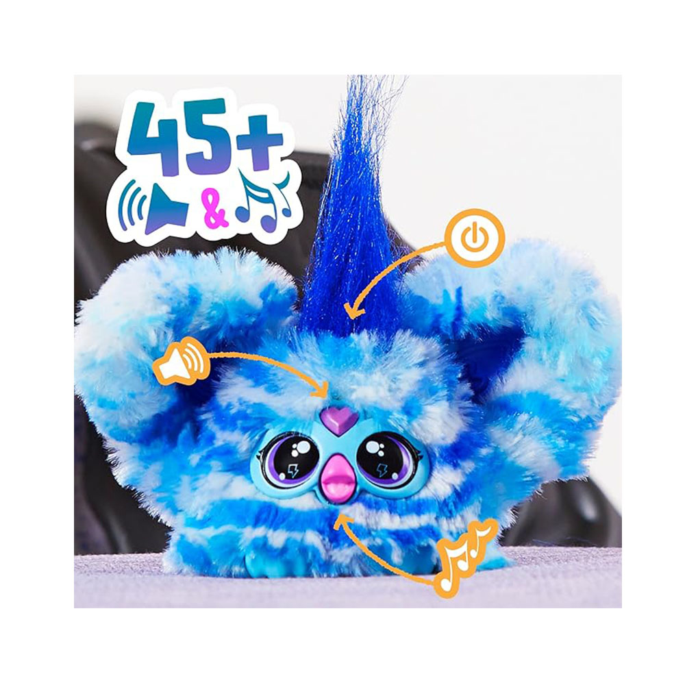 - 3 FORMAS DE ACTIVAR MÚSICA Y FRASES: Presione sus picos para divertirse alimentando ruidos y toque las gemas del corazón para obtener música. La parte superior de sus cabezas activa frases divertidas de Furbish y las enciende y apaga