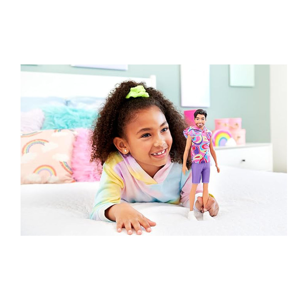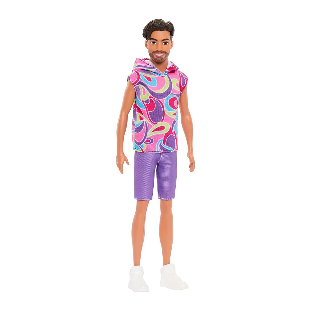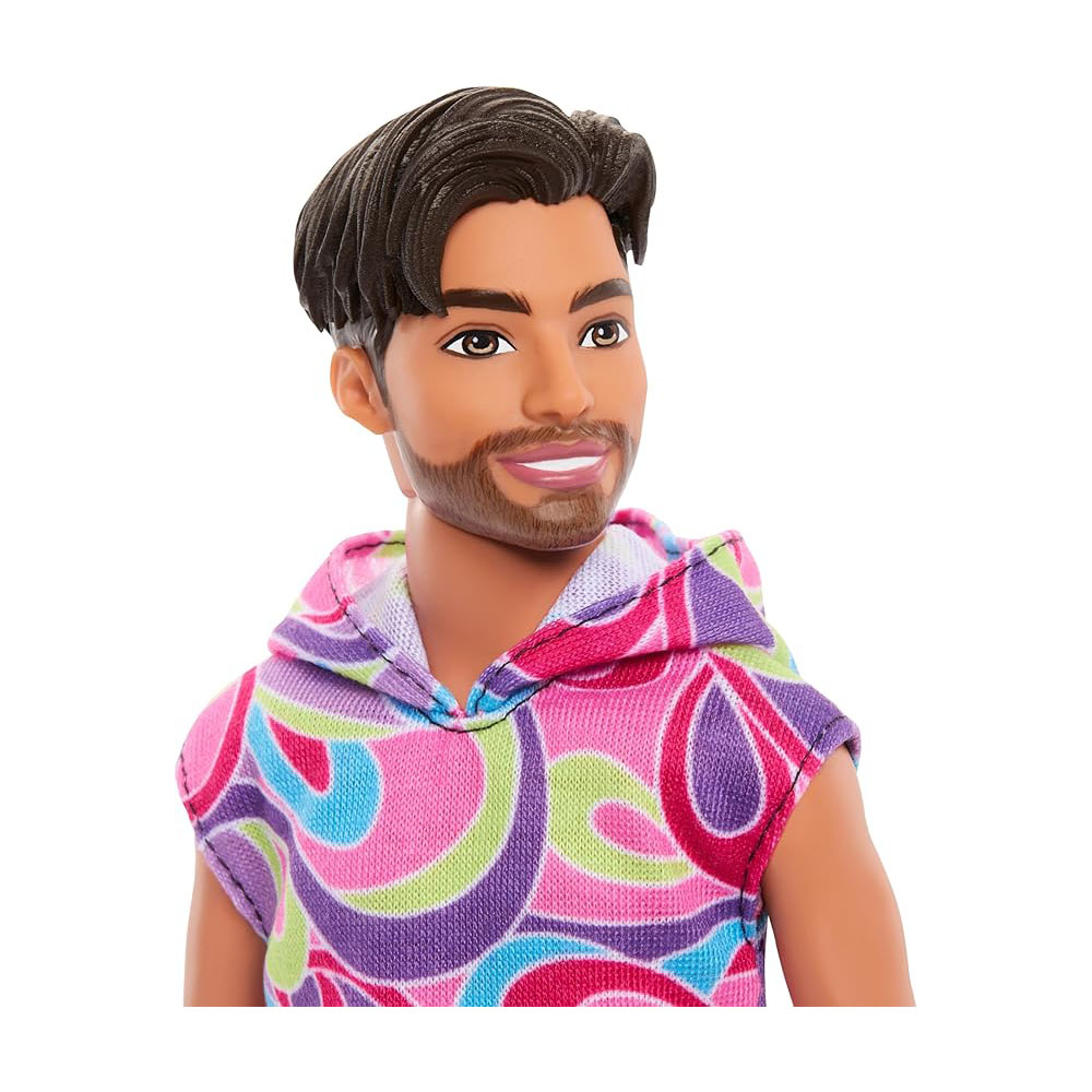 - La muñeca de moda Ken usa un aspecto inspirado en el icónico look Totally Hair de 1991 con una brillante camiseta con capucha con estampado gráfico colorido