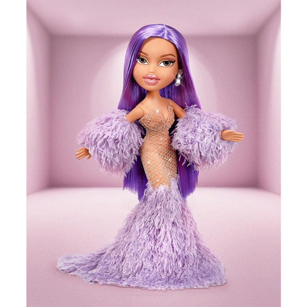 - DETALLES PREMIUM: Esta muñeca Kylie Jenner Bratz de 24” a gran escala tiene cabello de lavanda y un hermoso aspecto de maquillaje personalizado. Ella usa un vestido brillante y largo del piso con un tren y mangas de plumas moradas. También usa bombas de plata clásicas y aretes de plata.