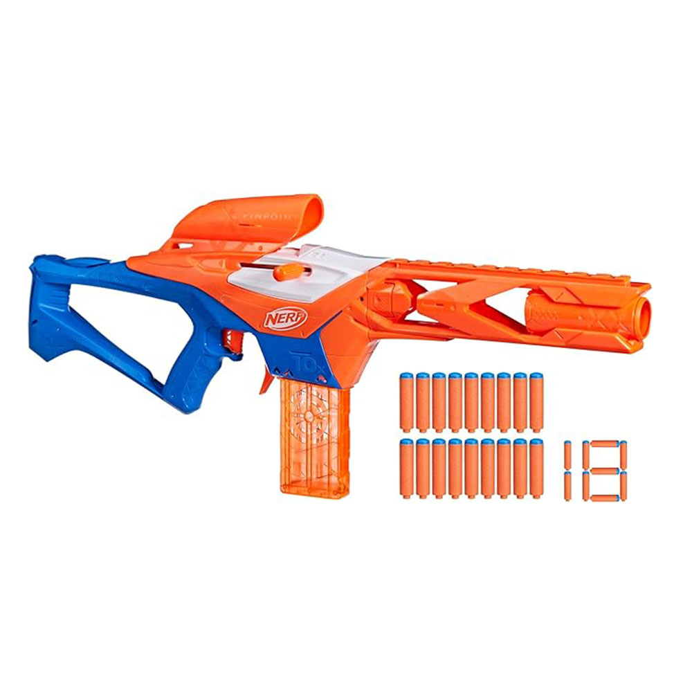 - NERF N SERIES PINPOINT BLASTER: El blaster Pinpoint está diseñado para una precisión de largo alcance, lo que le brinda la ventaja en juegos que exigen disparos de precisión a distancia. Compatible solo con dardos Nerf N Series N1